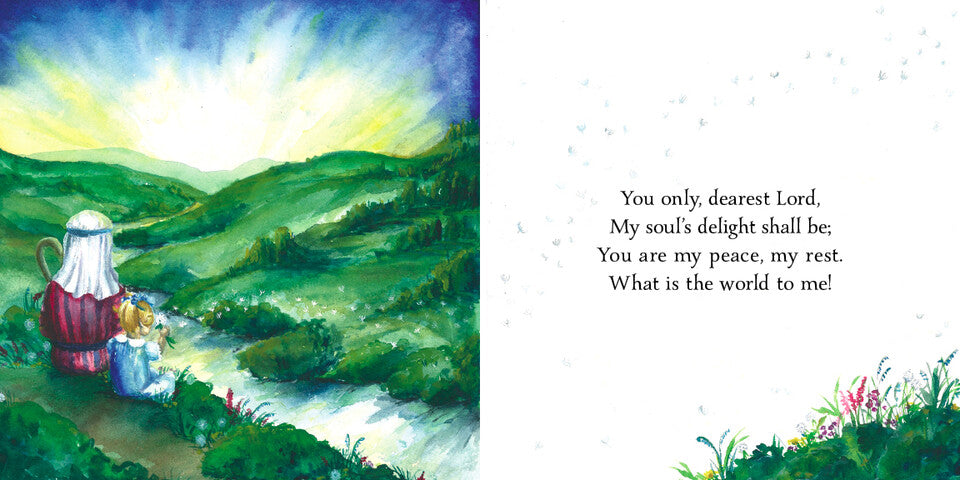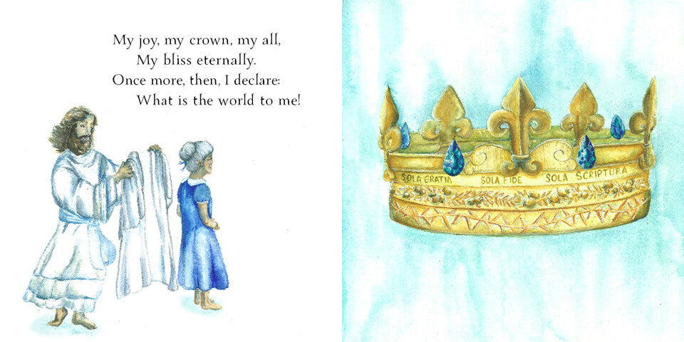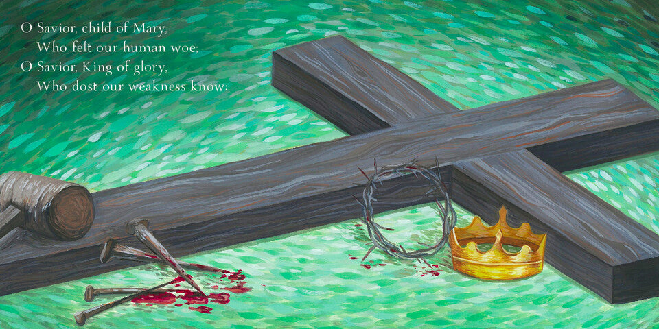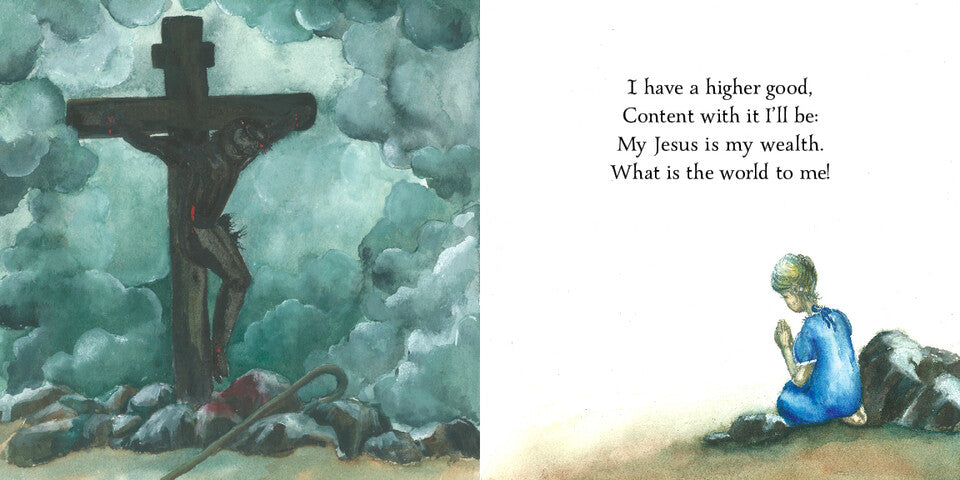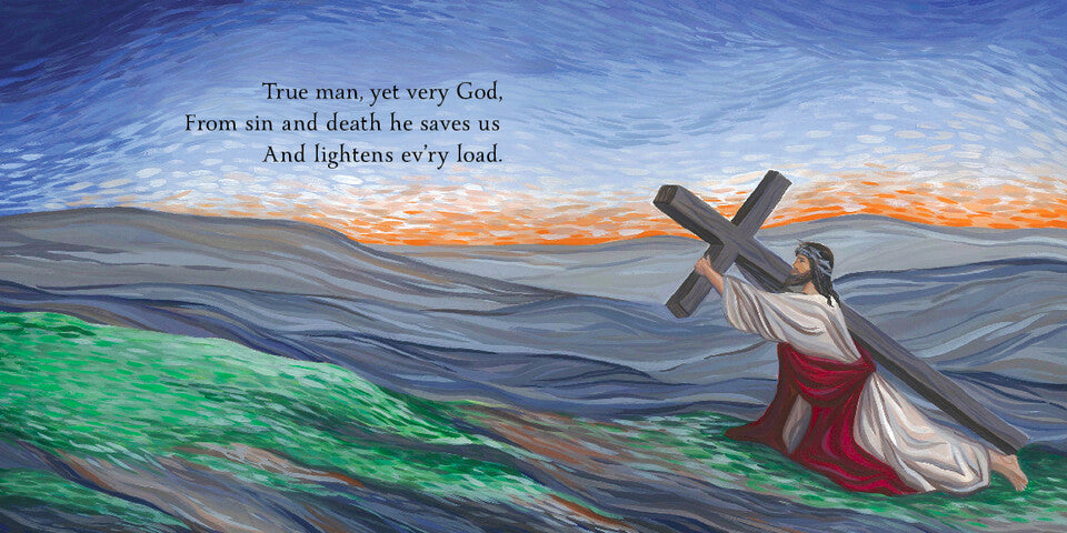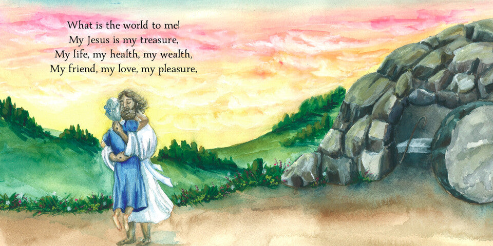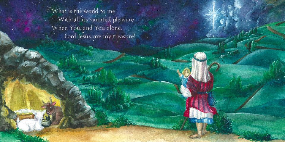 Travel through the pages of the traditional Christmas carol, Lo, How a Rose E’er Blooming, and see prophecies fulfilled in Christ’s birth, death, and resurrection. Flip the book over and sing What Is the World to Me. Marvel that Christ, though He was rich, became poor so that we might have heavenly riches, worth more than all earthly treasures.